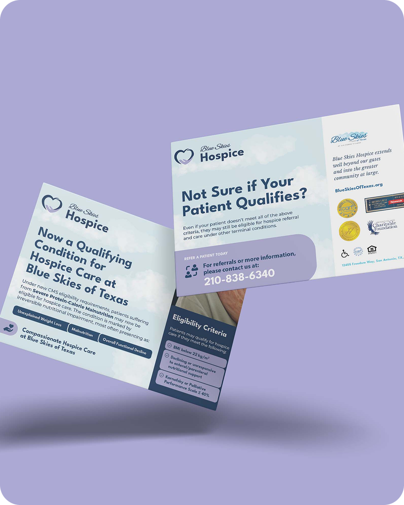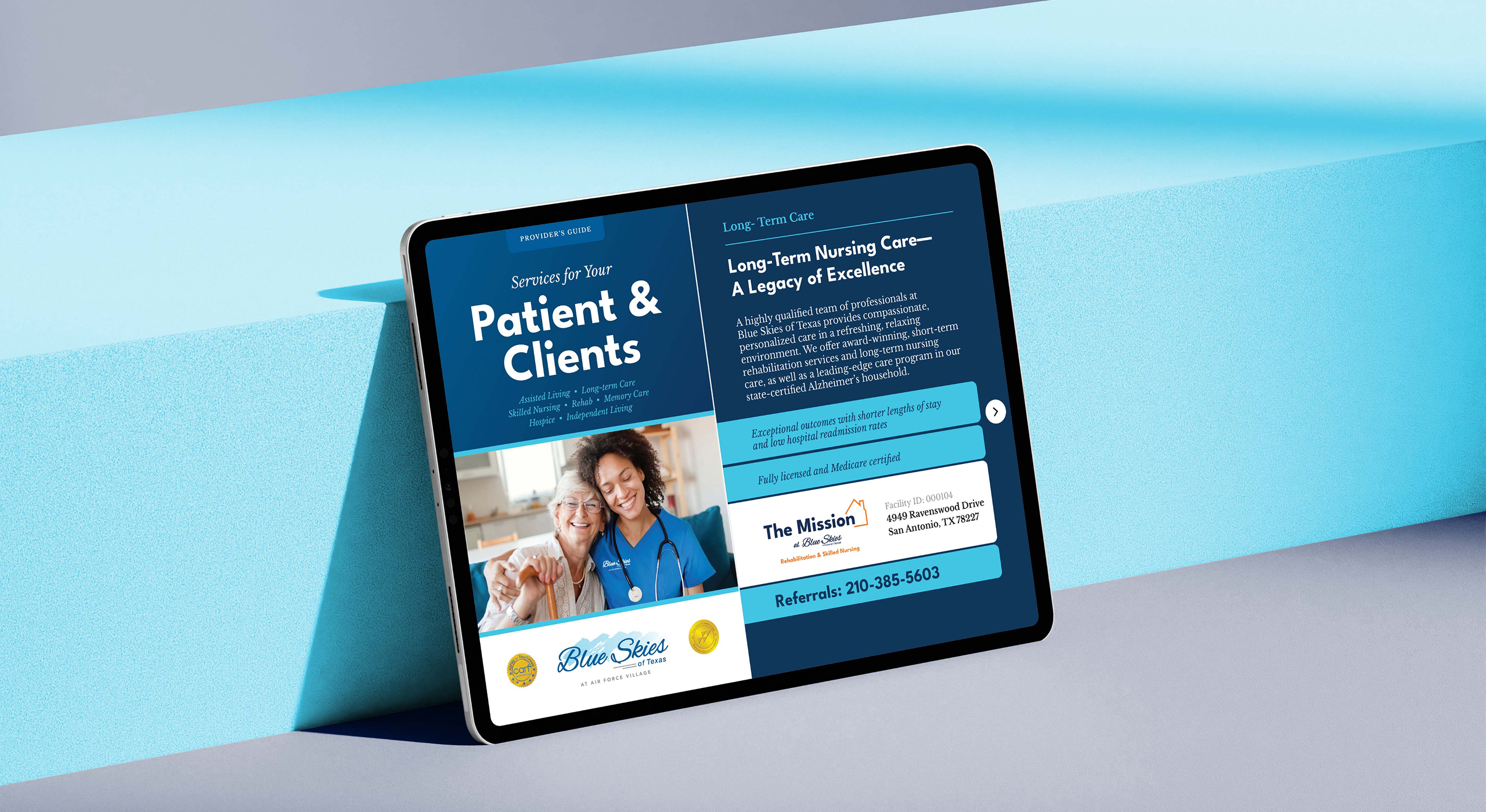 Medical Marketing Rx recognized the importance of referral relationships in an industry that specializes in multiple senior care specialties. By creating targeted materials and messaging aimed at physicians and hospital partners, they positioned Blue Skies of Texas as the preferred choice for senior care referrals. This strategy helped bridge the gap between hospitals, physicians, and Blue Skies of Texas, ensuring the brand was top-of-mind when patients and families needed trusted care options.